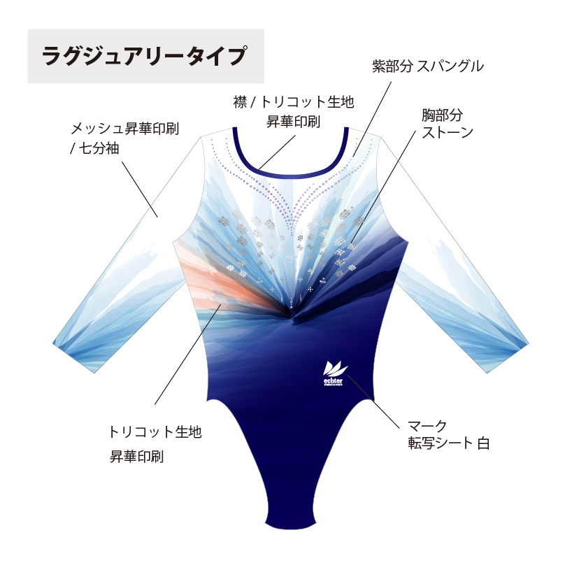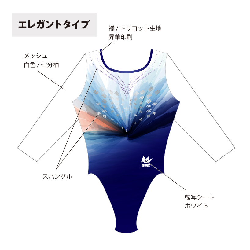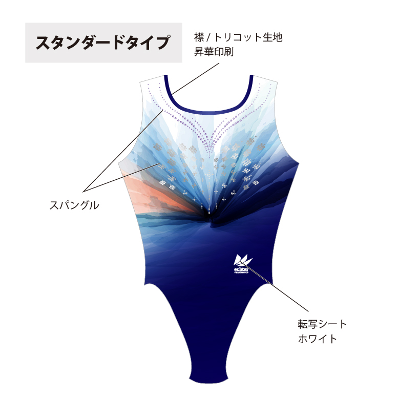 試合用を想定した豪華なデザインのレオタードです。 色変えと、チーム名加工(別途お見積り)も可能です。 ご希望の場合は「お問い合わせ」よりご相談くださいませ。 掲載写真はラグジュアリータイプの仕様となります。 下記三つの仕様からお選びいただけます。 ラグジュアリータイプ エレガントタイプ スタンダードタイプ ※エレガントとスタンダードタイプの仕様は画像よりご確認ください。