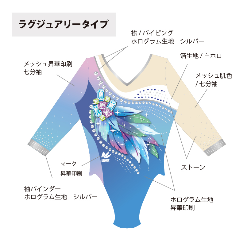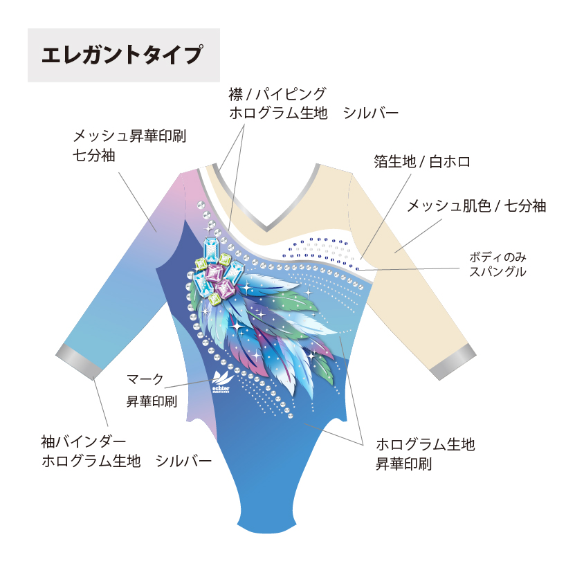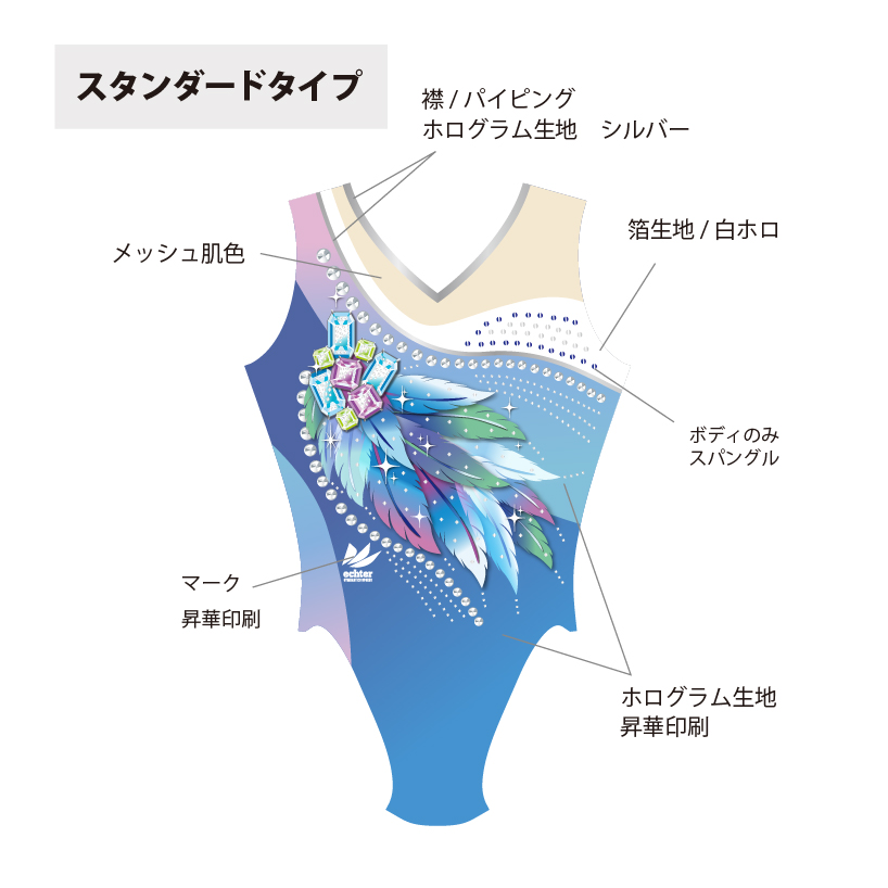 試合用を想定した豪華なデザインのレオタードです。 色変えと、チーム名加工(別途お見積り)も可能です。 ご希望の場合は「お問い合わせ」よりご相談くださいませ。 掲載写真はラグジュアリータイプの仕様となります。 下記三つの仕様からお選びいただけます。 ラグジュアリータイプ エレガントタイプ スタンダードタイプ ※エレガントとスタンダードタイプの仕様は画像よりご確認ください。