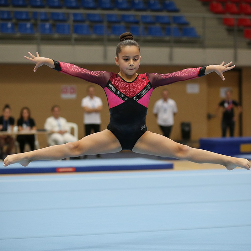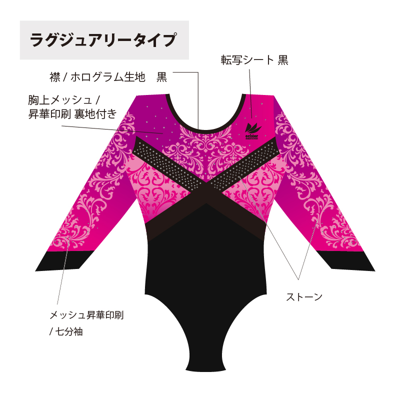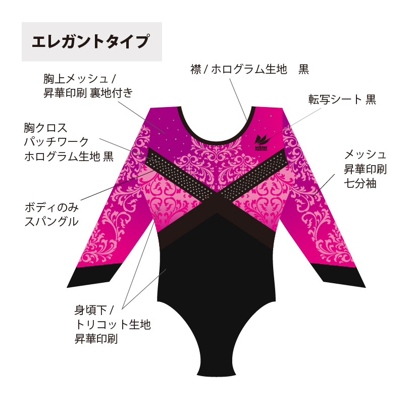 試合用を想定した豪華なデザインのレオタードです。 色変えと、チーム名加工(別途お見積り)も可能です。 ご希望の場合は「お問い合わせ」よりご相談くださいませ。 掲載写真はラグジュアリータイプの仕様となります。 下記二つの仕様からお選びいただけます。 ラグジュアリータイプ エレガントタイプ ※エレガントタイプの仕様は画像よりご確認ください。