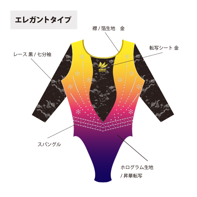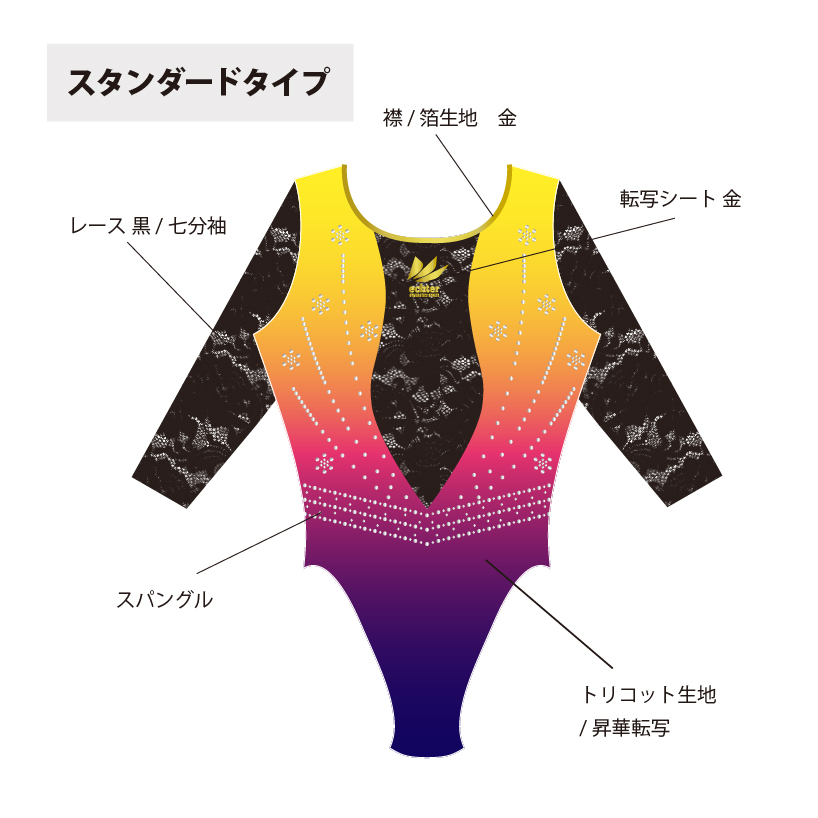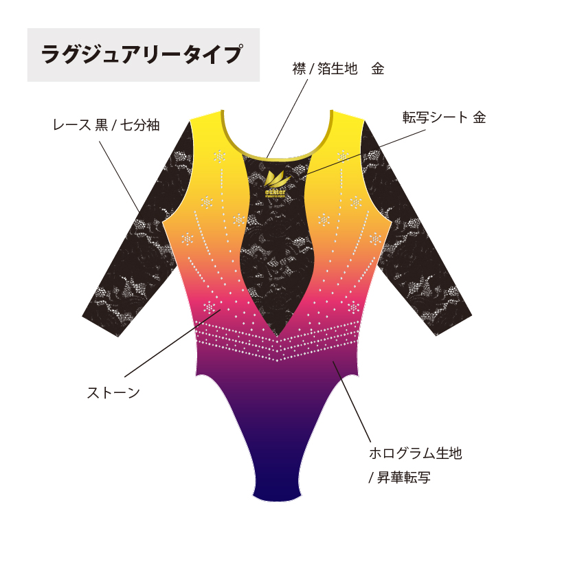 試合用を想定した豪華なデザインのレオタードです。 色変えと、チーム名加工(別途お見積り)も可能です。 ご希望の場合は「お問い合わせ」よりご相談くださいませ。 掲載写真はラグジュアリータイプの仕様となります。 下記三つの仕様からお選びいただけます。 ラグジュアリータイプ エレガントタイプ スタンダードタイプ ※エレガントとスタンダードタイプの仕様は画像よりご確認ください。