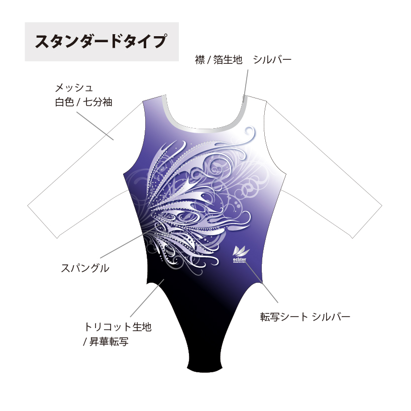 試合用を想定した豪華なデザインのレオタードです。 色変えと、チーム名加工(別途お見積り)も可能です。 ご希望の場合は「お問い合わせ」よりご相談くださいませ。 掲載写真はラグジュアリータイプの仕様となります。 下記三つの仕様からお選びいただけます。 ラグジュアリータイプ エレガントタイプ スタンダードタイプ ※エレガントとスタンダードタイプの仕様は画像よりご確認ください。