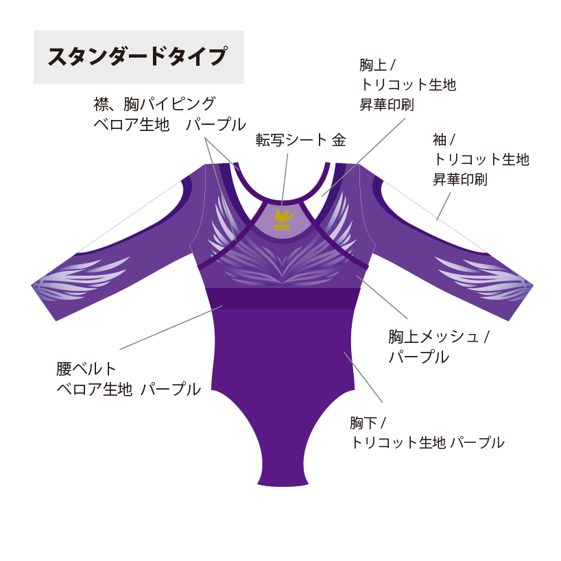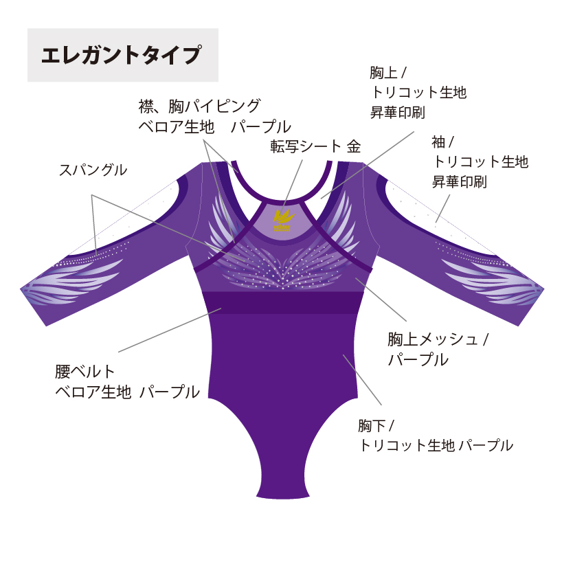 試合用を想定した豪華なデザインのレオタードです。 色変えと、チーム名加工(別途お見積り)も可能です。 ご希望の場合は「お問い合わせ」よりご相談くださいませ。 掲載写真はラグジュアリータイプの仕様となります。 下記三つの仕様からお選びいただけます。 ラグジュアリータイプ エレガントタイプ スタンダードタイプ ※エレガントとスタンダードタイプの仕様は画像よりご確認ください。