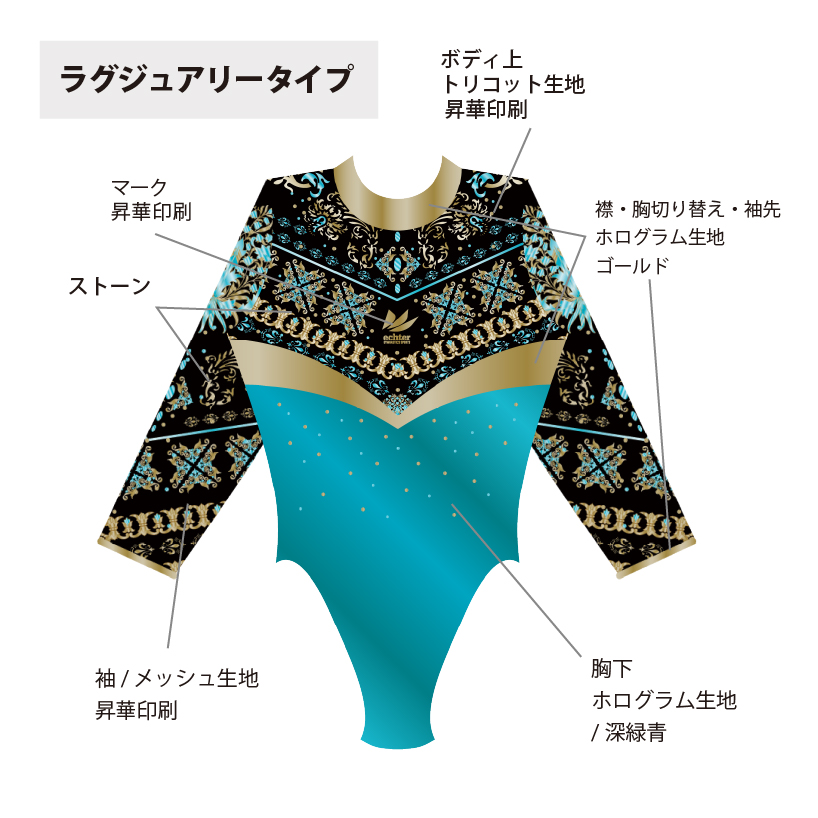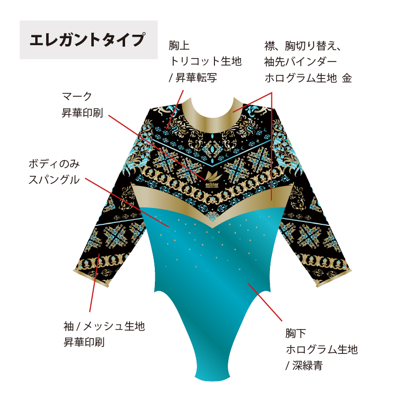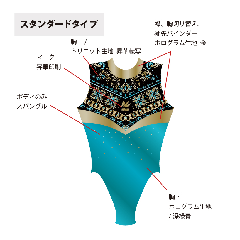 試合用を想定した豪華なデザインのレオタードです。 色変えと、チーム名加工(別途お見積り)も可能です。 ご希望の場合は「お問い合わせ」よりご相談くださいませ。 掲載写真はラグジュアリータイプの仕様となります。 下記三つの仕様からお選びいただけます。 ラグジュアリータイプ エレガントタイプ スタンダードタイプ ※エレガントとスタンダードタイプの仕様は画像よりご確認ください。