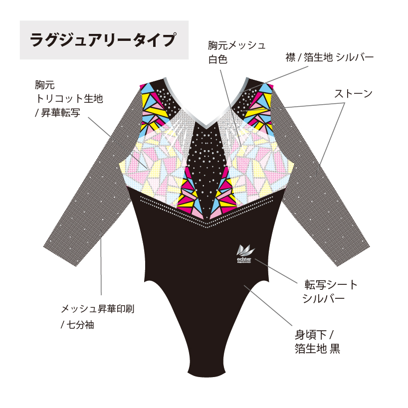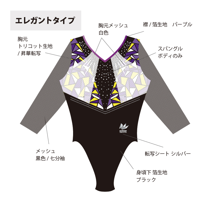 試合用を想定した豪華なデザインのレオタードです。 色変えと、チーム名加工(別途お見積り)も可能です。 ご希望の場合は「お問い合わせ」よりご相談くださいませ。 掲載写真はラグジュアリータイプの仕様となります。 下記三つの仕様からお選びいただけます。 ラグジュアリータイプ(レインボー) エレガントタイプ(パープル) スタンダードタイプ(ピンク) ※エレガントとスタンダードタイプの仕様は画像よりご確認ください。