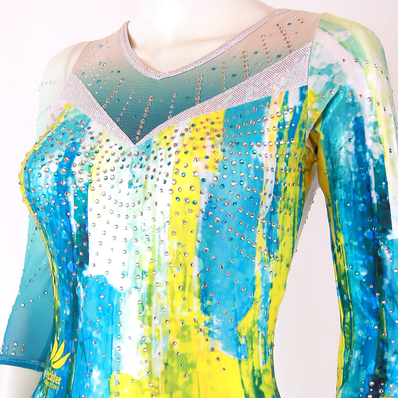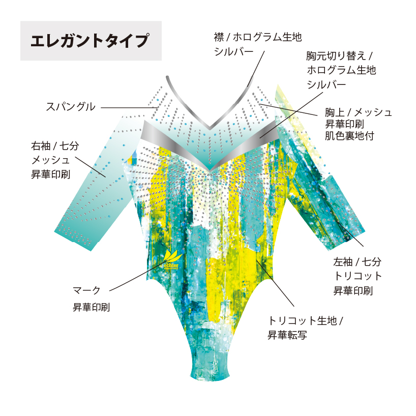 試合用を想定した豪華なデザインのレオタードです。 色変えと、チーム名加工(別途お見積り)も可能です。 ご希望の場合は「お問い合わせ」よりご相談くださいませ。 掲載写真はラグジュアリータイプの仕様となります。 下記二つの仕様からお選びいただけます。 ラグジュアリータイプ エレガントタイプ ※エレガントタイプの仕様は画像よりご確認ください。
