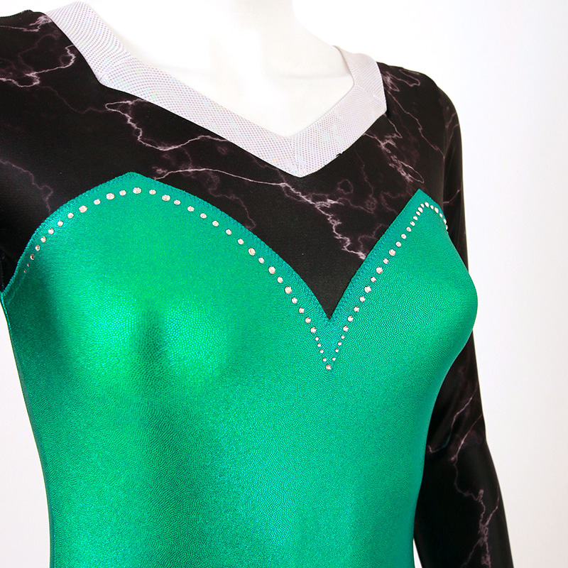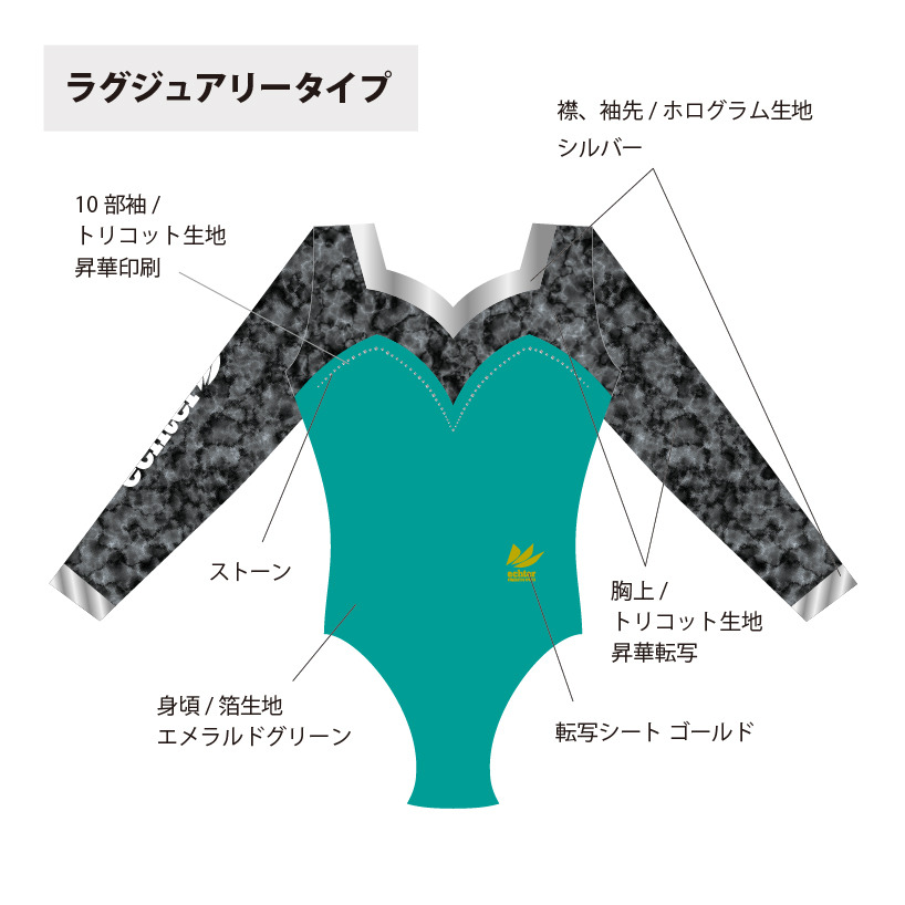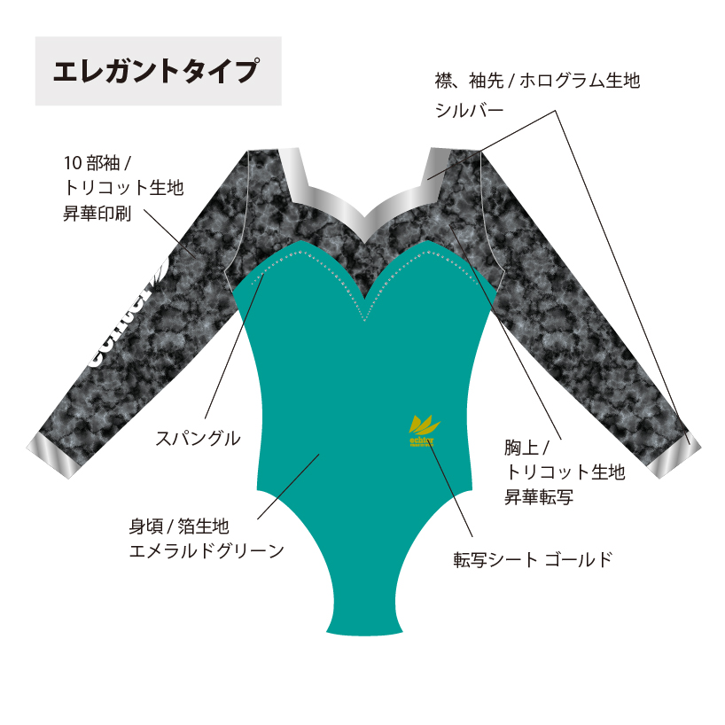 試合用を想定した豪華なデザインのレオタードです。 色変えと、チーム名加工(別途お見積り)も可能です。 ご希望の場合は「お問い合わせ」よりご相談くださいませ。 掲載写真はラグジュアリータイプの仕様となります。 下記二つの仕様からお選びいただけます。 ラグジュアリータイプ エレガントタイプ ※エレガントタイプの仕様は画像よりご確認ください。