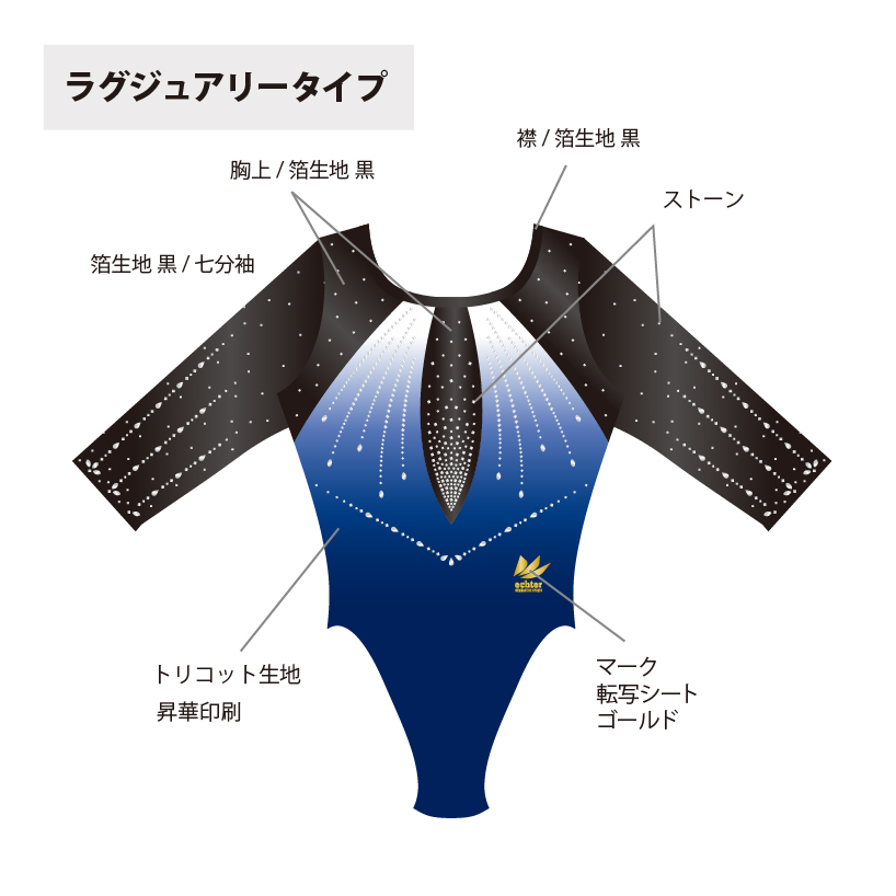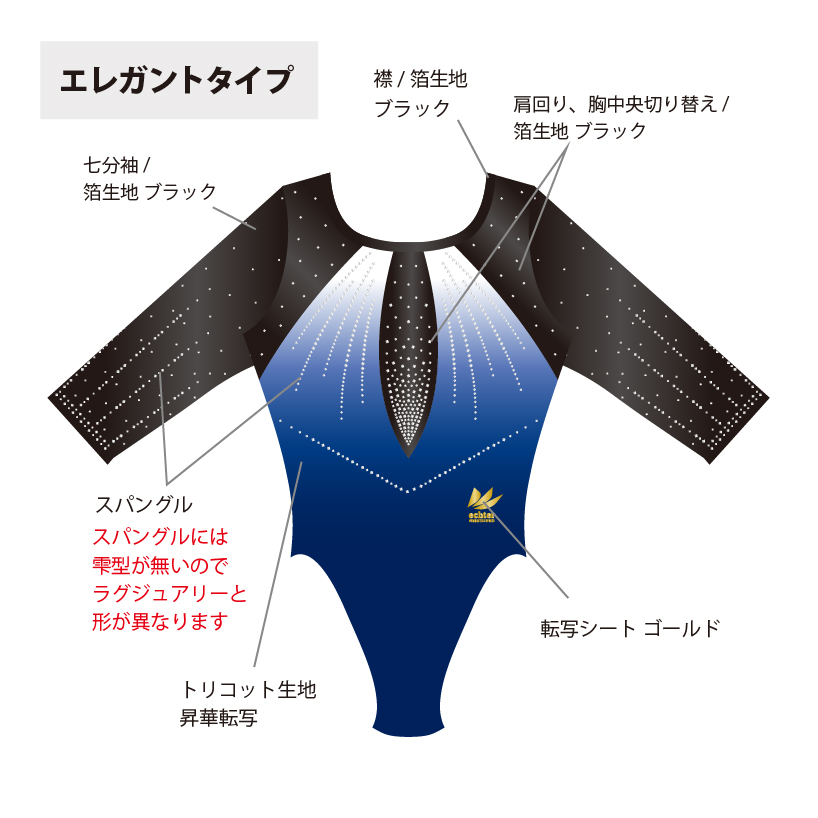試合用を想定した豪華なデザインのレオタードです。 色変えと、チーム名加工(別途お見積り)も可能です。 ご希望の場合は「お問い合わせ」よりご相談くださいませ。 掲載写真はラグジュアリータイプの仕様となります。 下記三つの仕様からお選びいただけます。 ラグジュアリータイプ エレガントタイプ ※エレガントタイプの仕様は画像よりご確認ください。