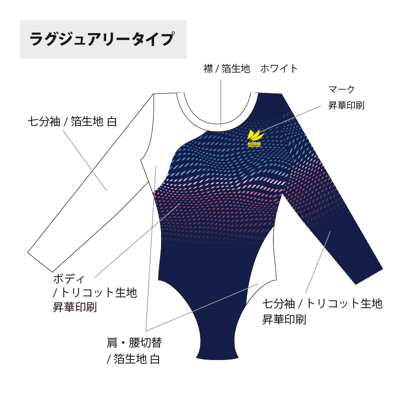 試合用を想定した豪華なデザインのレオタードです。 色変えと、チーム名加工(別途お見積り)も可能です。 ご希望の場合は「お問い合わせ」よりご相談くださいませ。 掲載写真はラグジュアリータイプの仕様となります。