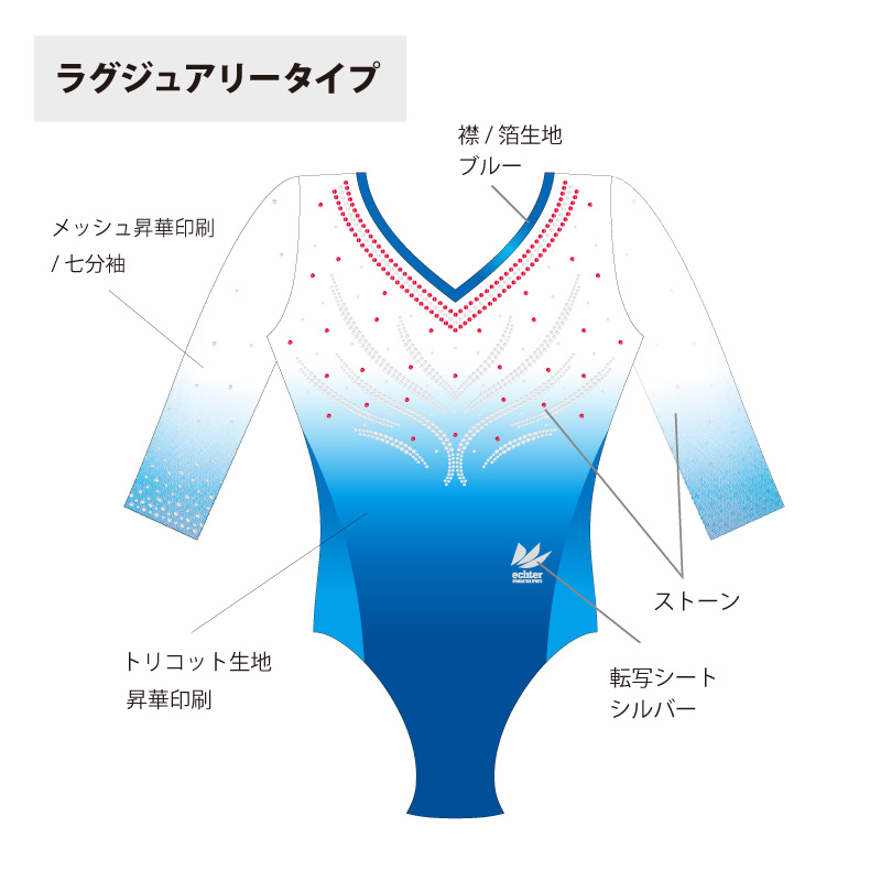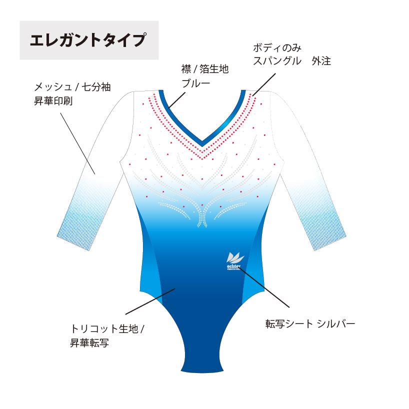 試合用を想定した豪華なデザインのレオタードです。 色変えと、チーム名加工(別途お見積り)も可能です。 ご希望の場合は「お問い合わせ」よりご相談くださいませ。 掲載写真はラグジュアリータイプの仕様となります。 下記三つの仕様からお選びいただけます。 ラグジュアリータイプ エレガントタイプ スタンダードタイプ ※エレガントとスタンダードタイプの仕様は画像よりご確認ください。