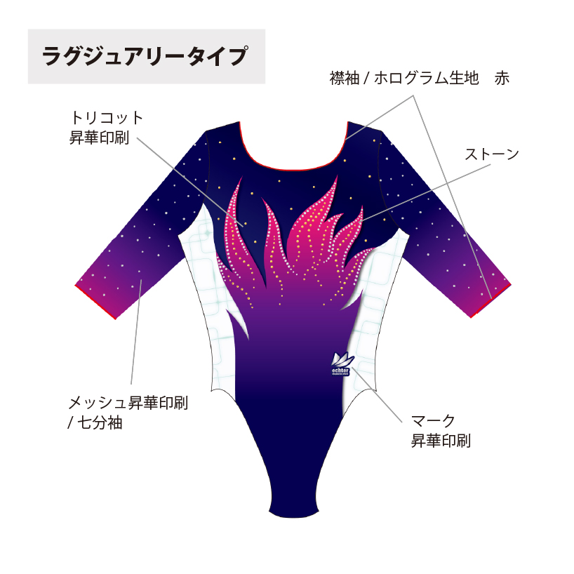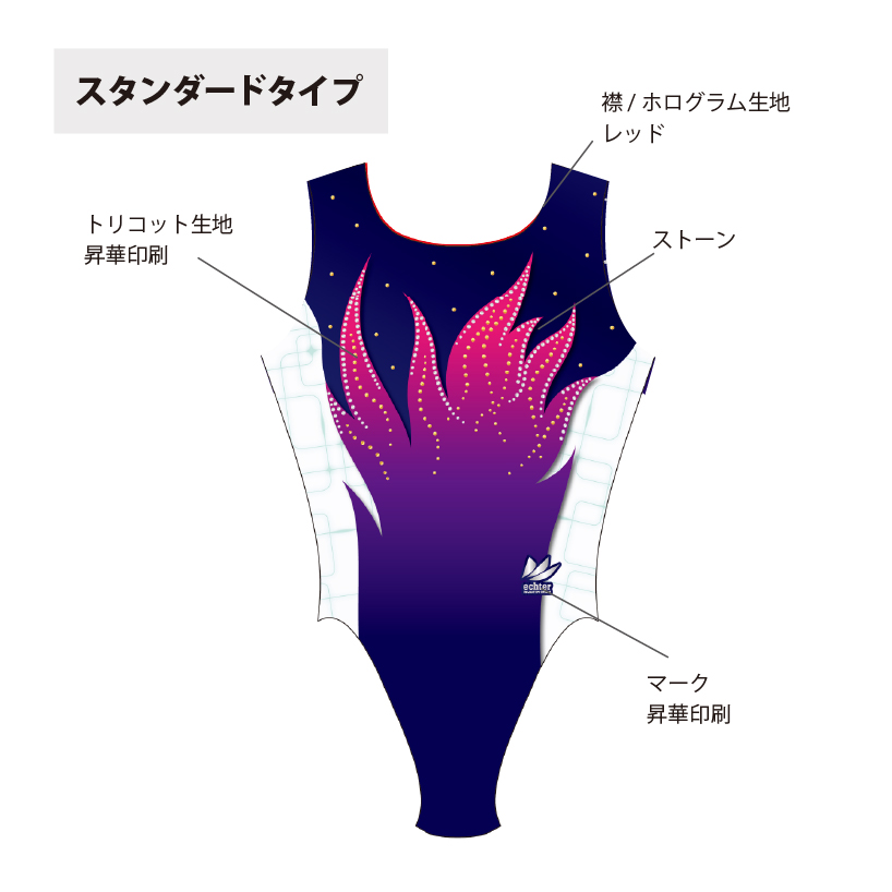試合用を想定した豪華なデザインのレオタードです。 色変えと、チーム名加工(別途お見積り)も可能です。 ご希望の場合は「お問い合わせ」よりご相談くださいませ。 掲載写真はラグジュアリータイプの仕様となります。 下記二つの仕様からお選びいただけます。 ラグジュアリータイプ スタンダードタイプ ※スタンダードタイプの仕様は画像よりご確認ください。