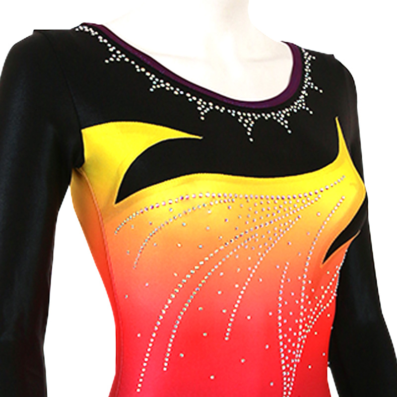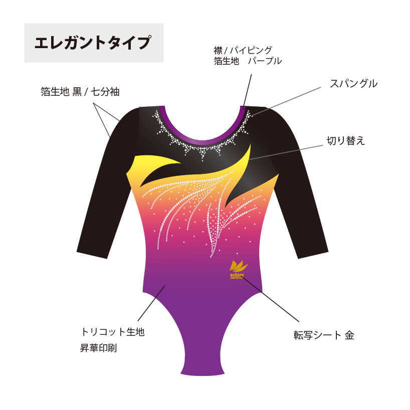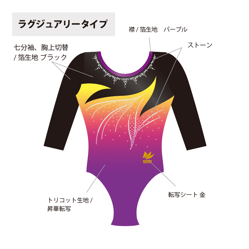 試合用を想定した豪華なデザインのレオタードです。 色変えと、チーム名加工(別途お見積り)も可能です。 ご希望の場合は「お問い合わせ」よりご相談くださいませ。 掲載写真はラグジュアリータイプの仕様となります。 下記二つの仕様からお選びいただけます。 ラグジュアリータイプ エレガントタイプ ※エレガントタイプの仕様は画像よりご確認ください。