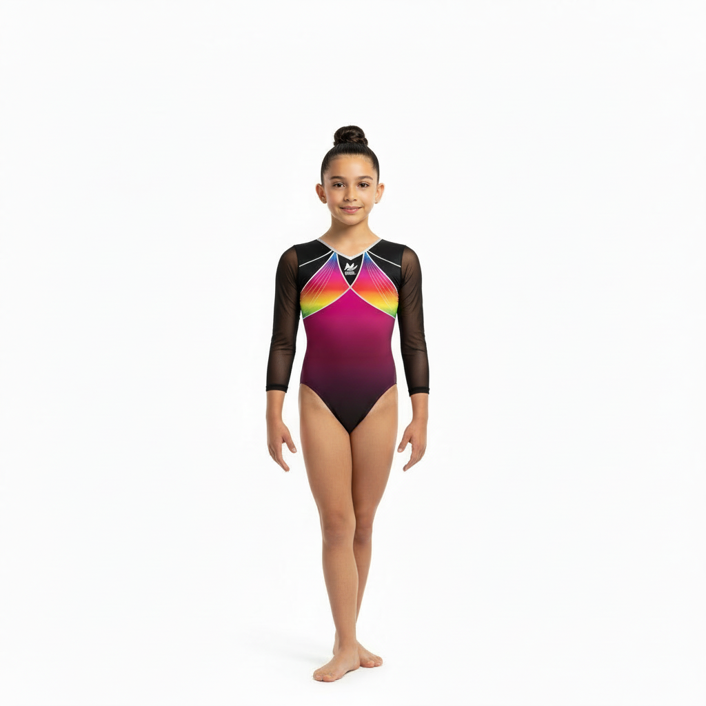 カラフルでスポーティなデザイン。 背面はシンプルで羽が生えたようなきらきらスパンコール。 前身頃も背面も楽しめる体操レオタードです。 ----------------------------------------- *袖付けカスタマイズ* こちらの商品は袖付け加工注文が可能です。 袖丈は、7分丈と9分丈をお選び頂けます。 袖の生地は、2種類からお選び頂けます。 (トリコット・メッシュ_袖カラー:ブラック) ※本商品は受注生産となりますので、 ご注文からお届けまで5~6週間程度、お時間を頂きます。
