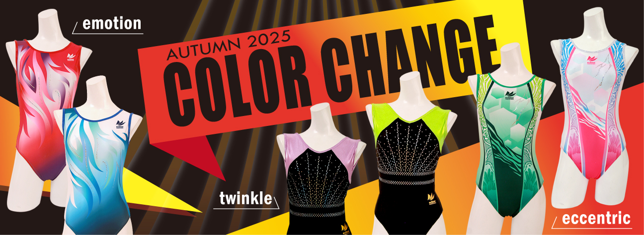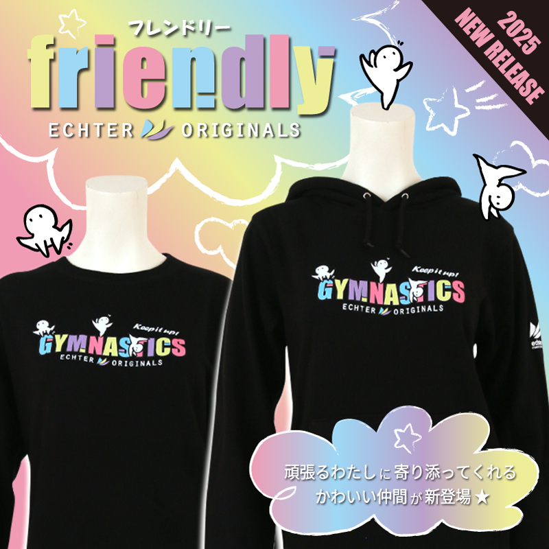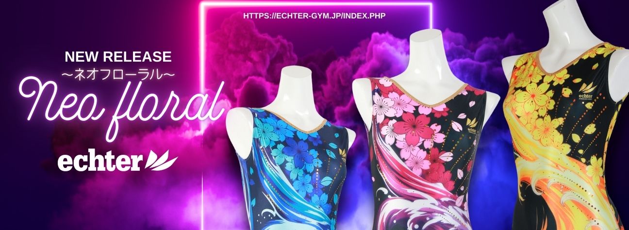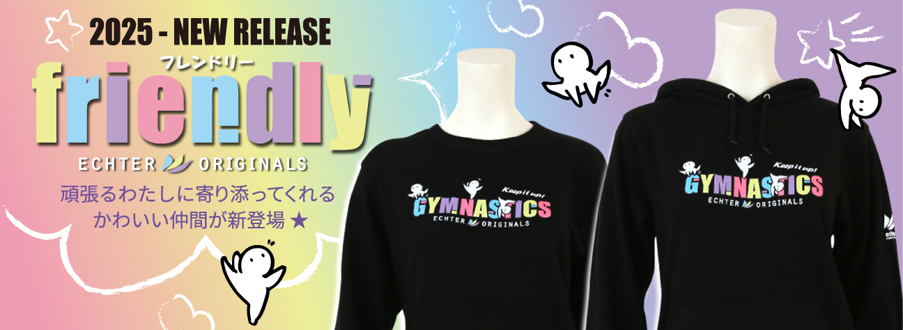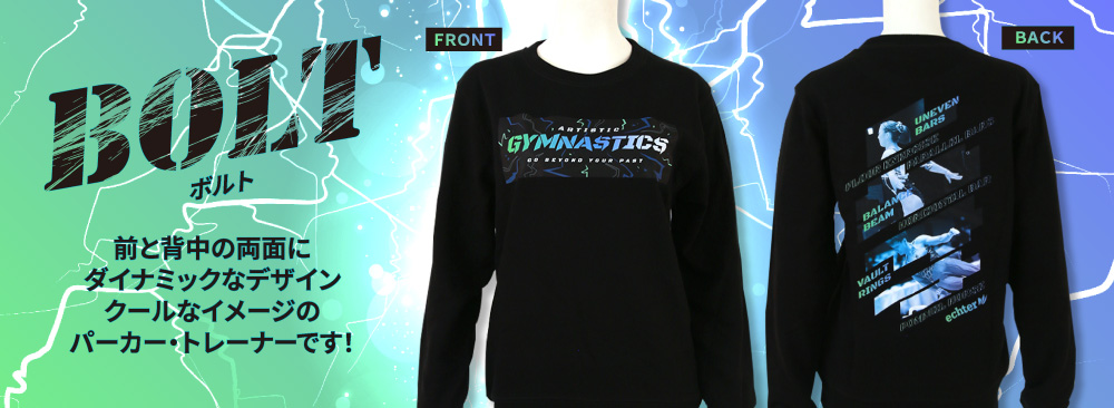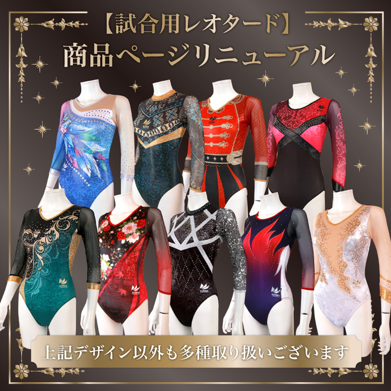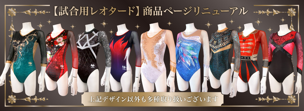女子レオタード、男子ユニフォーム、ジャージ、ハーフパンツ、Tシャツなど